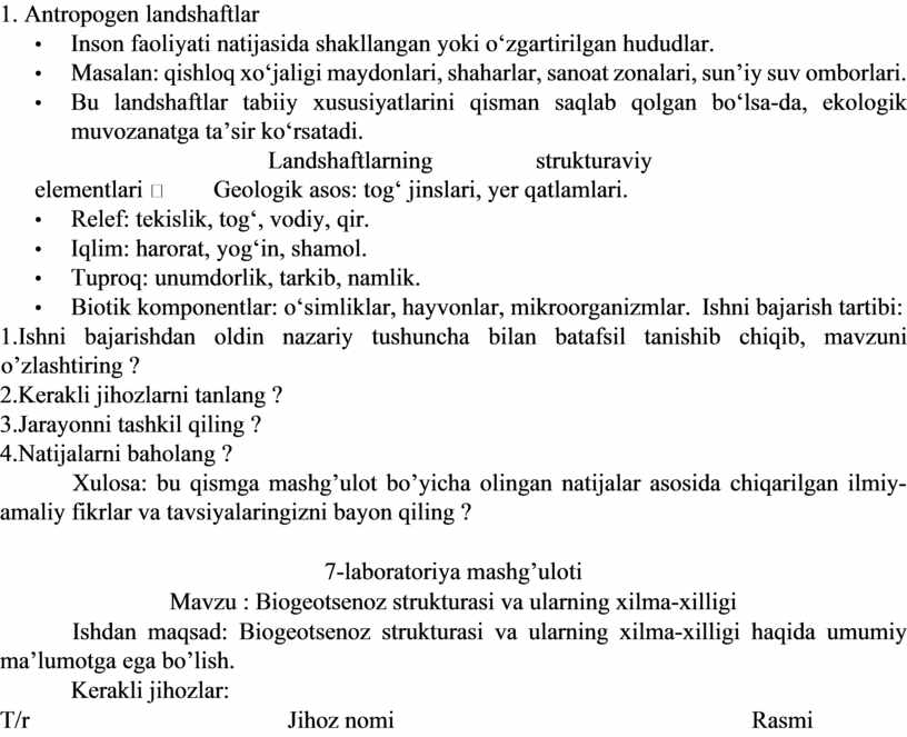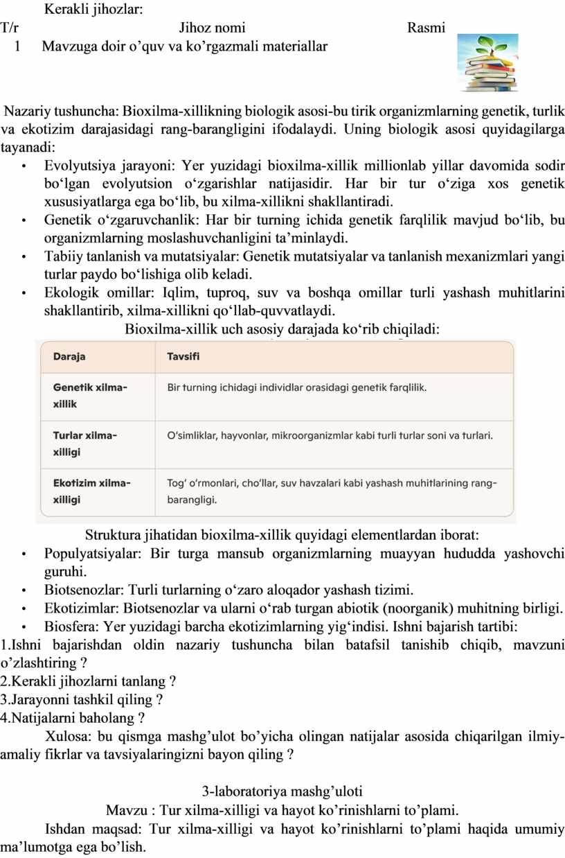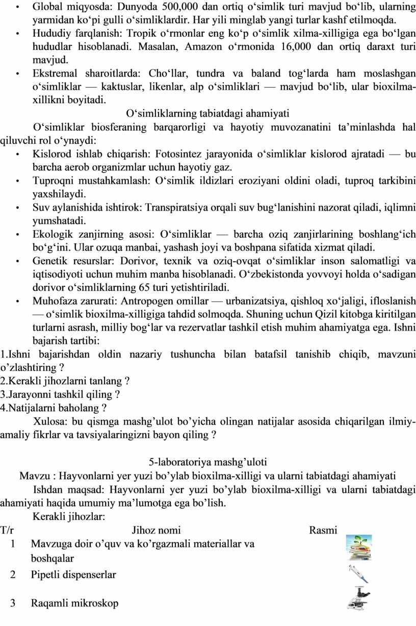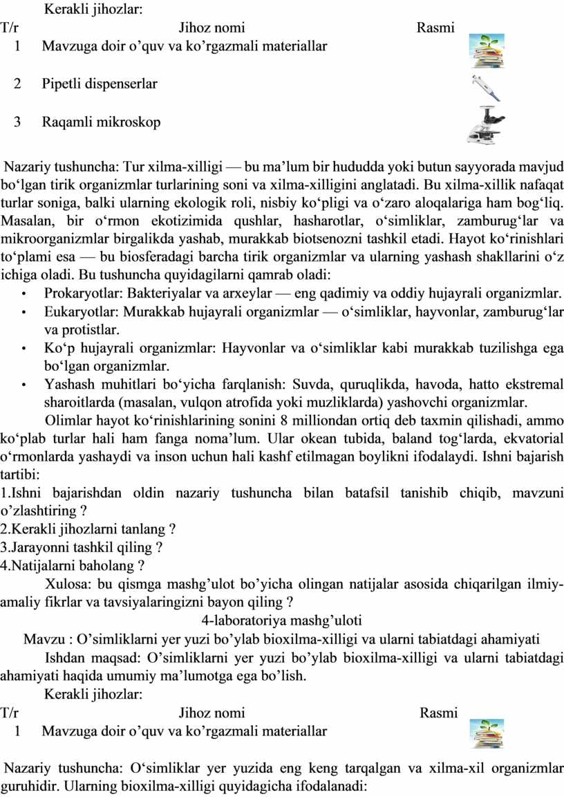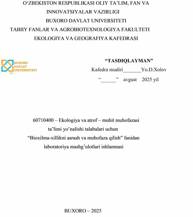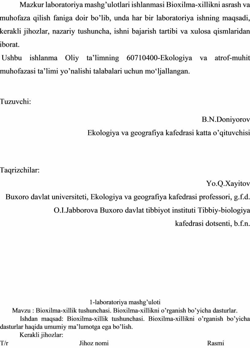 Mazkur laboratoriya mashg’ulotlari ishlanmasi Bioxilma-xillikni asrash va muhofaza qilish faniga doir bo’lib, unda har bir laboratoriya ishning maqsadi, kerakli jihozlar, nazariy tushuncha, ishni bajarish tartibi va xulosa qismlaridan iborat.
