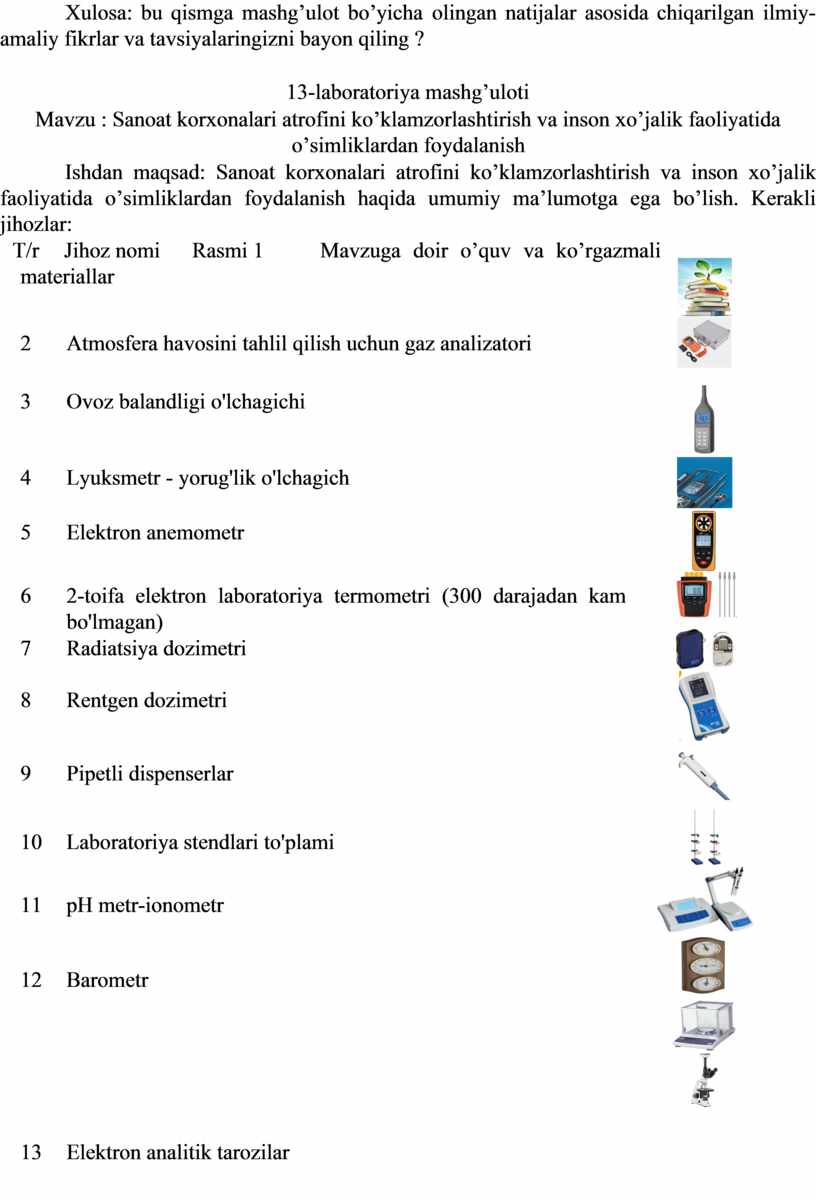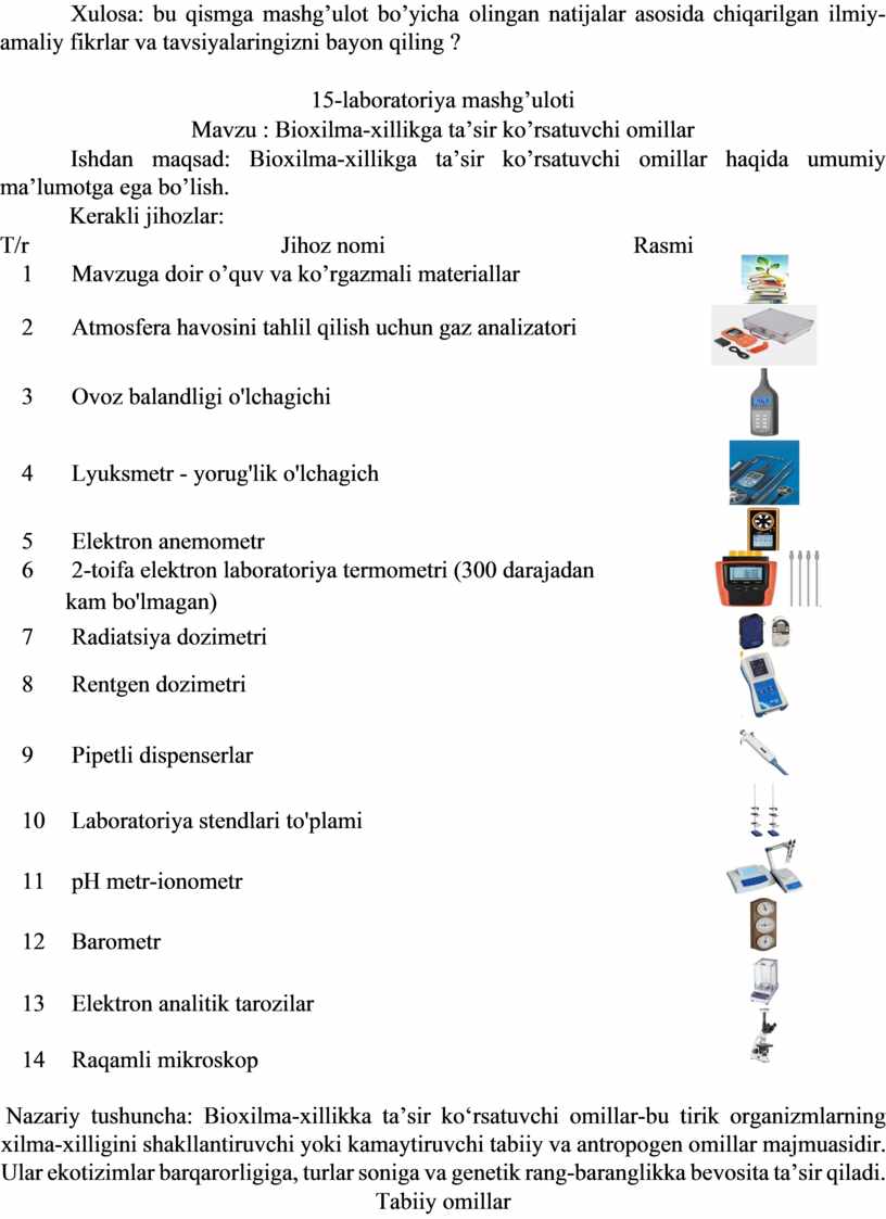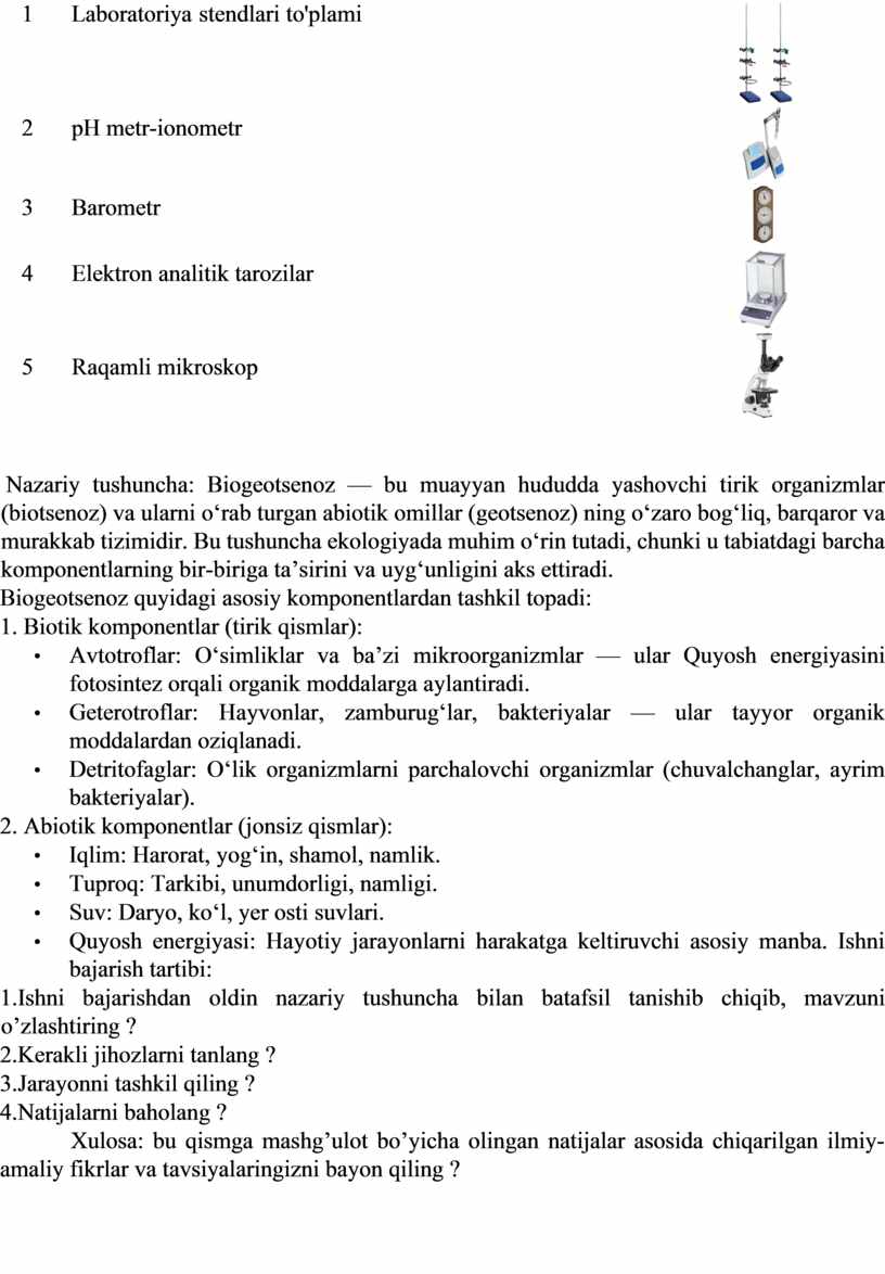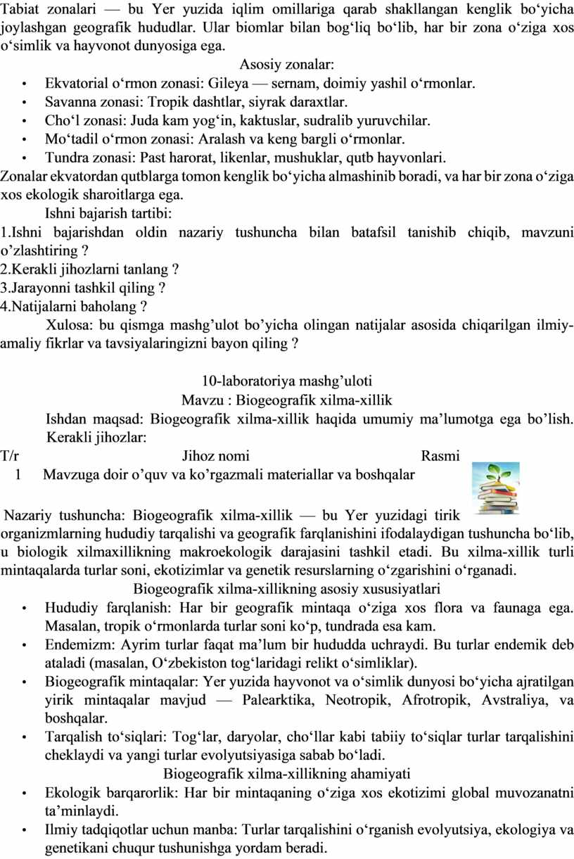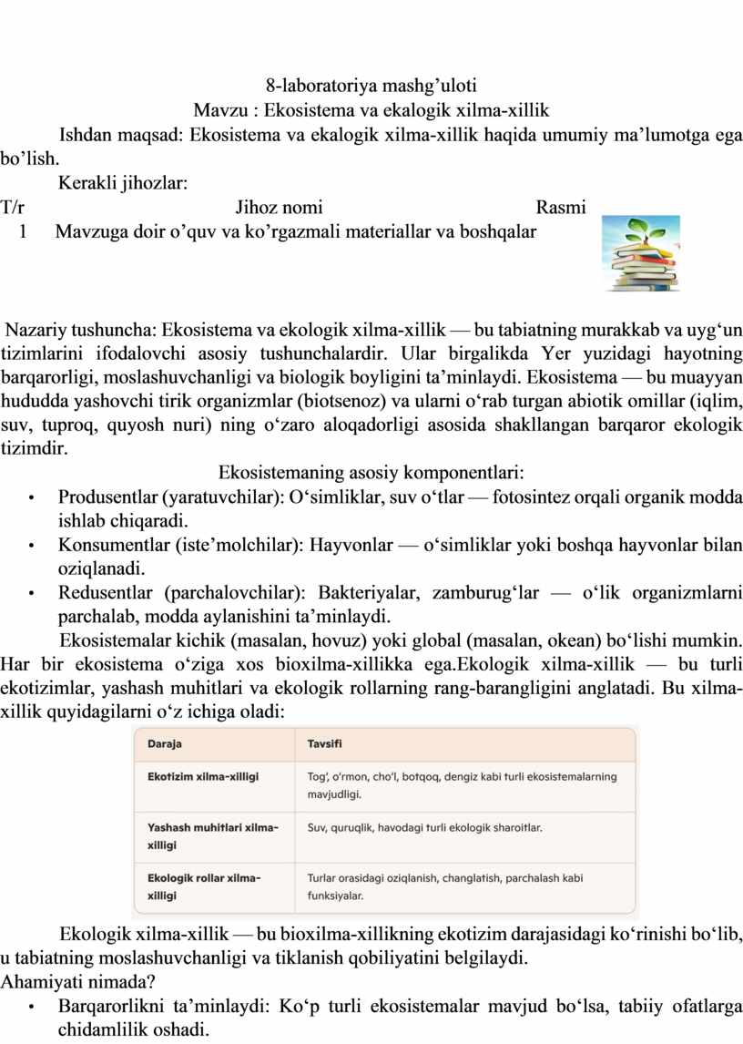 Mazkur laboratoriya mashg’ulotlari ishlanmasi Bioxilma-xillikni asrash va muhofaza qilish faniga doir bo’lib, unda har bir laboratoriya ishning maqsadi, kerakli jihozlar, nazariy tushuncha, ishni bajarish tartibi va xulosa qismlaridan iborat.
