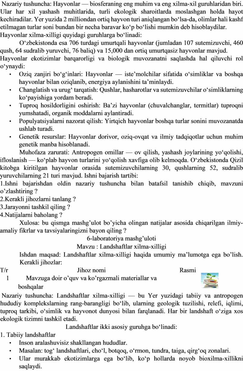 Nazariy tushuncha: Hayvonlar — biosferaning eng muhim va eng xilma-xil guruhlaridan biri. Ular har xil yashash muhitlarida, turli ekologik sharoitlarda moslashgan holda hayot kechiradilar. Yer yuzida 2 milliondan ortiq hayvon turi aniqlangan bo‘lsa-da, olimlar hali kashf etilmagan turlar soni bundan bir necha baravar ko‘p bo‘lishi mumkin deb hisoblaydilar.