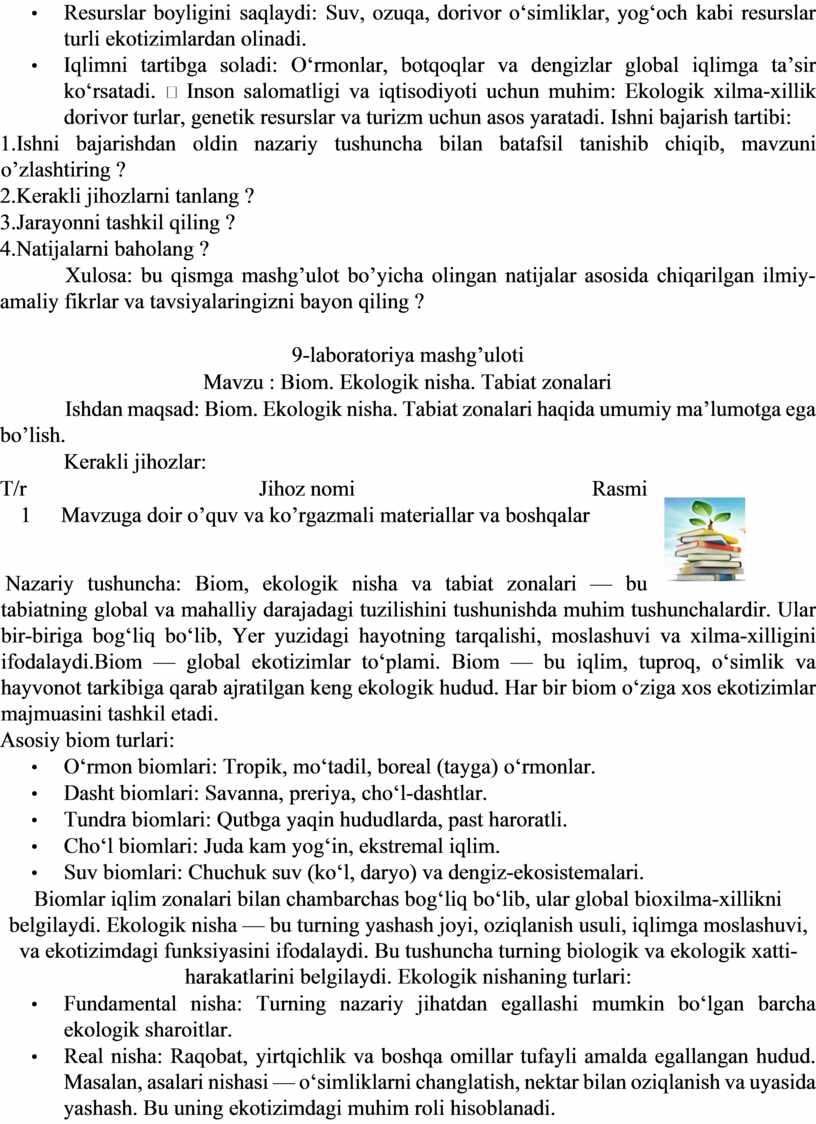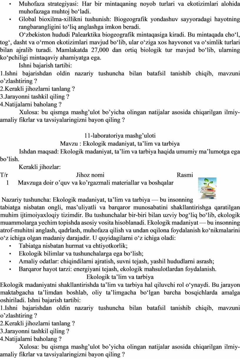• Muhofaza zarurati: Antropogen omillar — urbanizatsiya, qishloq xo‘jaligi, ifloslanish — o‘simlik bioxilma-xilligiga tahdid solmoqda. Shuning uchun Qizil kitobga kiritilgan turlarni asrash, milliy bog‘lar va rezervatlar tashkil etish muhim ahamiyatga ega. Ishni bajarish tartibi: