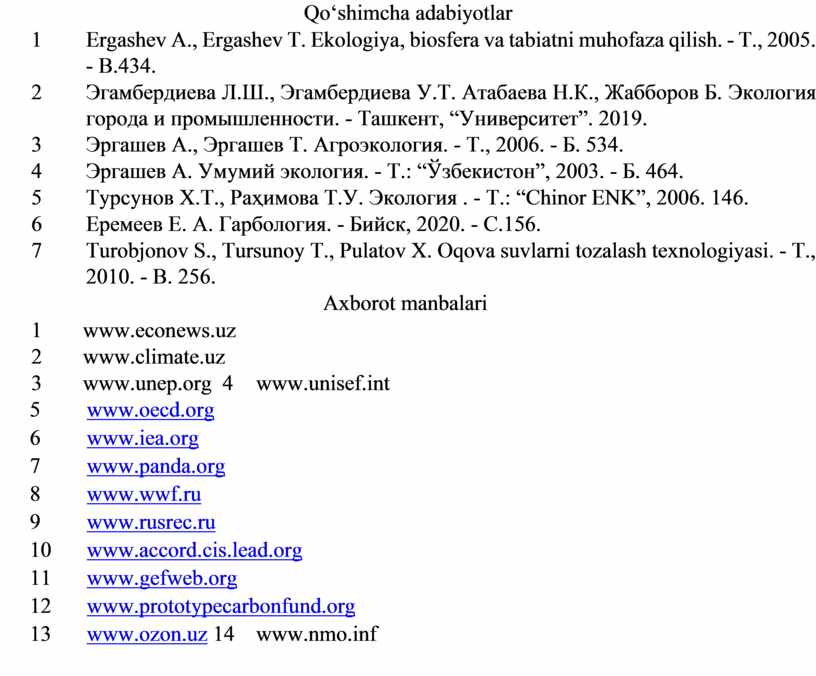 2 Эгамбердиева Л.Ш., Эгамбердиева У.Т. Атабаева Н.К., Жабборов Б. Экология города и промышленности. - Ташкент, “Университет”. 2019.
