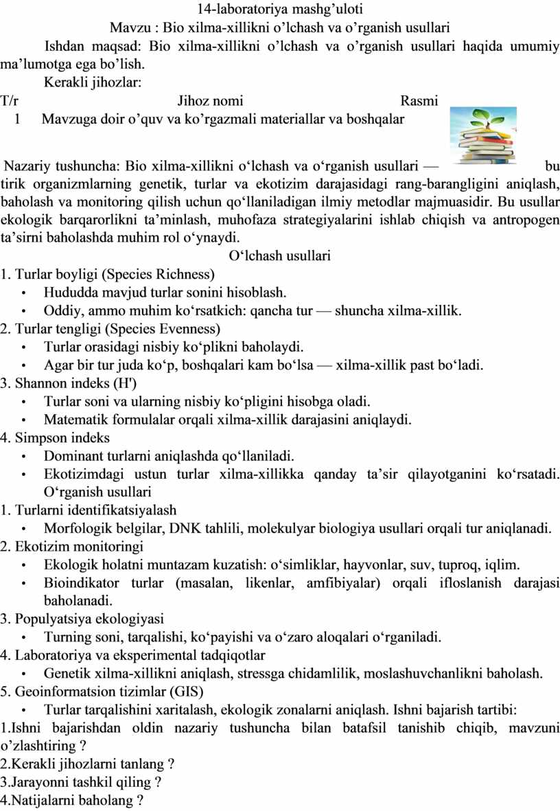 Ishdan maqsad: Bio xilma-xillikni o’lchash va o’rganish usullari haqida umumiy ma’lumotga ega bo’lish.