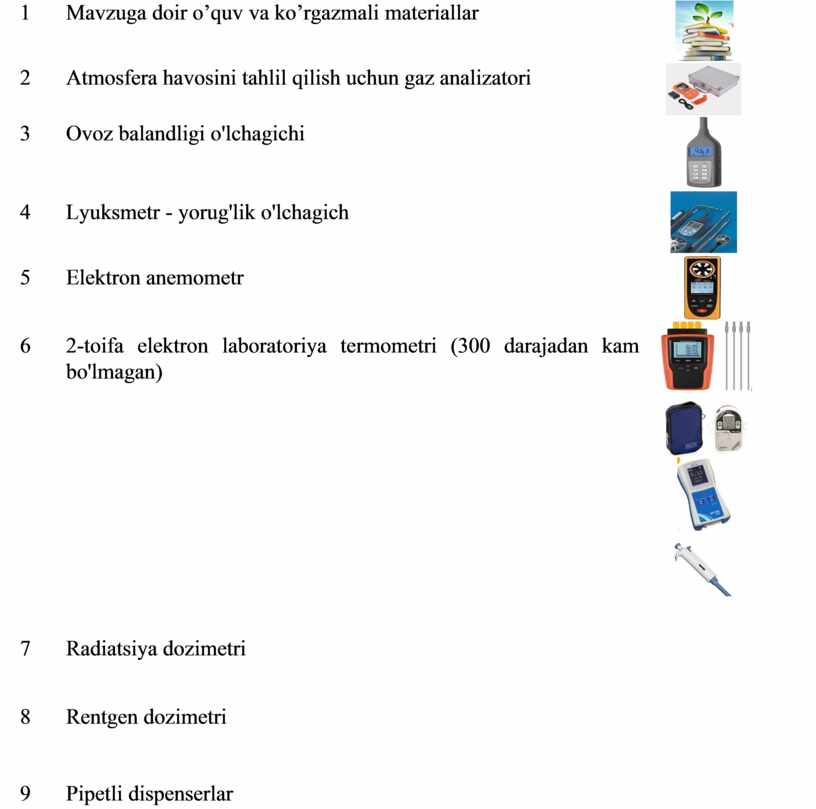 o’quv va ko’rgazmali materiallar va boshqalar.