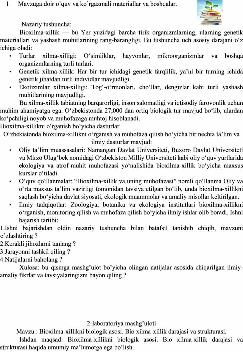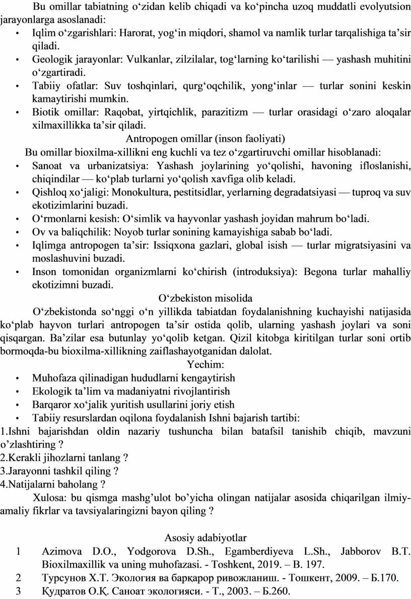 1 Azimova D.O., Yodgorova D.Sh., Egamberdiyeva L.Sh., Jabborov B.T. Bioxilmaxillik va uning muhofazasi. - Toshkent, 2019. – B. 197.