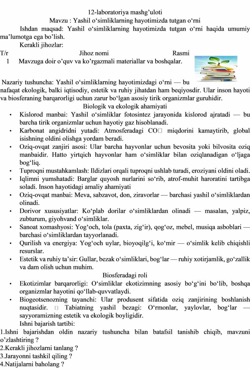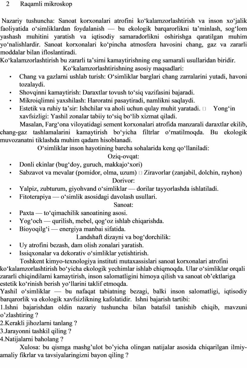 Yashil o‘simliklar — bu nafaqat tabiatning bezagi, balki inson salomatligi, iqtisodiy barqarorlik va ekologik xavfsizlikning kafolatidir. Ishni bajarish tartibi: