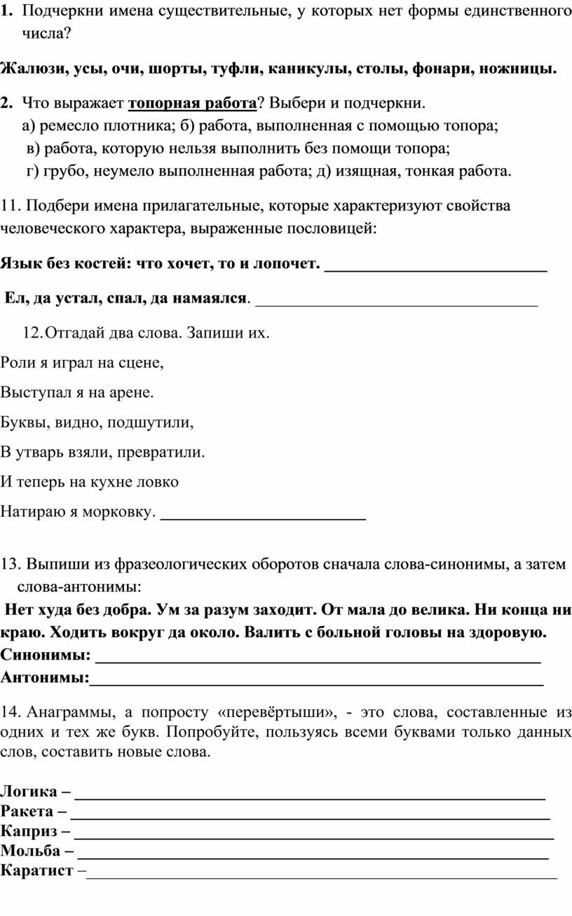14. Анаграммы, а попросту «перевёртыши», - это слова, составленные из одних и тех же букв. Попробуйте, пользуясь всеми буквами только данных слов, составить новые слова. 5б