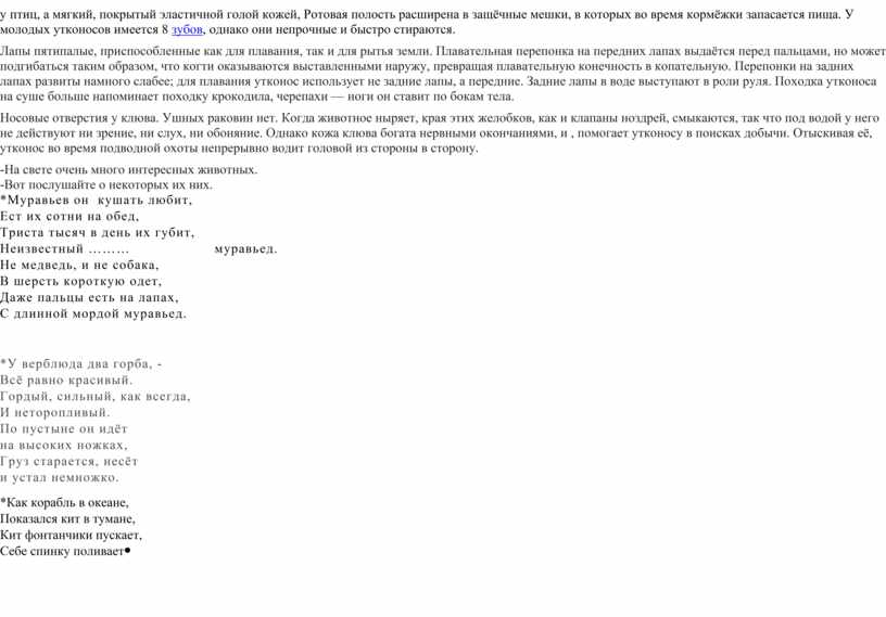(Открытие нового знания) Вопросы тебя обгоняют гурьбой. Одно «почему» меж деревьями мчится, Летит по пятам за неведомой птицей. Другое – пчелой забралось на цветок, А третье – лягушкою скок в ручеёк. «Что» мышкой шныряет под листьями в норах, «Кто» ищет в кустах притаившийся шорох, Сидит «отчего» на зелёном листке, «Куда» полетело верхом на жуке, «Зачем» вслед за ящеркой влезло на пень… Вопрос за вопросом, и так целый день Пойдем - ка, дружок, по тропинке лесной Ответы искать под зелёным шатром. -У вас на столах лежат картинки животных. Посмотрите на них внимательно. --Определите, какие части тела они имеют? -А вот одного героя определить не смогли, может кто-то подскажет, кто это? Рассказ об утконосе. - Водоплавающее млекопитающее , обитающее в Австралии. Возник вопрос, к какой группе животных отнести утконоса. И вот немецкий биолог Меккель обнаружил, что у утконоса самка выкармливает детёнышей молоком , хотя и откладывает яйца, Тело у коротконогое; хвост уплощённый, похож на хвост бобра, но покрыт шерстью, которая с возрастом заметно редеет. В хвосте утконоса, откладываются запасы жира. Мех у него густой, мягкий, обычно тёмно-коричневый на спине и рыжеватый или серый на брюхе. Голова круглая. Впереди вытянут в плоский клюв длиной около 65 мм, шириной 50 мм. Клюв не жёсткий, как у птиц, а мягкий, покрытый эластичной голой кожей, Ротовая полость расширена в защёчные мешки, в которых во время кормёжки запасается пища. У молодых утконосов имеется 8 зубов, однако они непрочные и быстро стираются. Лапы пятипалые, приспособленные как для плавания, так и для рытья земли. Плавательная перепонка на передних лапах выдаётся перед пальцами, но может подгибаться таким образом, что когти оказываются выставленными наружу, превращая плавательную конечность в копательную. Перепонки на задних лапах развиты намного слабее; для плавания утконос использует не задние лапы, а передние. Задние лапы в воде выступают в роли руля. Походка утконоса на суше больше напоминает походку крокодила, черепахи — ноги он ставит по бокам тела. Носовые отверстия у клюва. Ушных раковин нет. Когда животное ныряет, края этих желобков, как и клапаны ноздрей, смыкаются, так что под водой у него не действуют ни зрение, ни слух, ни обоняние. Однако кожа клюва богата нервными окончаниями, и , помогает утконосу в поисках добычи. Отыскивая её, утконос во время подводной охоты непрерывно водит головой из стороны в сторону. -На свете очень много интересных животных. -Вот послушайте о некоторых их них. *Муравьев он кушать любит,