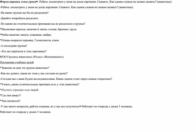 -Ребята .посмотрите у меня на доске картинки. Скажите. Как одним словом их можно назвать? (животные) -На какие группы вы бы их разделили? -Давайте попробуем разделить -По каким же отличительным признакам вы их разделили в группы? *Насекомые-крылья, наличие 6 лапок, голова ,брюшко, грудь *Рыбы-наличие чашуи, плавники, жабры *Птицы-покрыты перьями, 2 конечности, клюв -А последняя группа? - Кто же спрятался в этих картинках? МЭО Группы животных (Раздел «Вспоминаем») Постановка учебных целей *Знакома ли нам эта группа животных? -Как вы думает, какая же тема у нас сегодня на уроке? -Сегодня мы с вами будем исследователями. Какие задачи стоят перед новым открытием? *Узнать, какие отличительные признаки есть у этих животных? *Изучить строение тела зверей *Где они живут? *Чем питаются? -У нас много вопросов, работа сложная, но у нас все получится. |