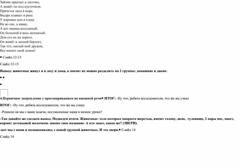 Слайд 12-13 Вывод: животные живут и в лесу и дома, а значит их можно разделить на 2 группы: домашние и дикие.