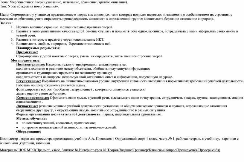 Цель: Формировать у учащихся представление о зверях как животных, тело которых покрыто шерстью; познакомить с особенностями их строения; с местами их обитания, учить определять принадлежность животного к определенной группе; воспитывать бережное отношение к природе.