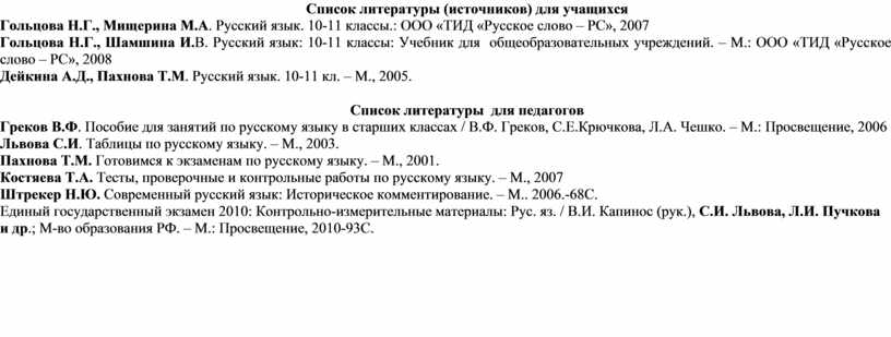 2. Гольцова Н.Г., Шамшина И.В. Русский язык: 10-11 классы: Учебник для общеобразовательных учреждений. – М.: ООО «ТИД «Русское слово – РС», 2008