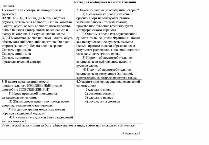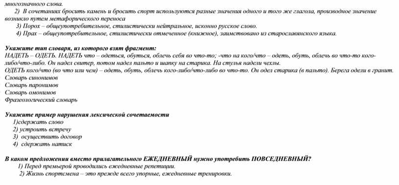 1.Укажите тип словаря, из которого взят фрагмент: НАДЕТЬ – ОДЕТЬ. НАДЕТЬ что – одеться, обуться, облечь себя во что-то; -что на кого/что – одеть, обуть, облечь во что-то кого-либо/что-либо. Он надел свитер, потом надел пальто и шапку на старика. На стулья надели чехлы. ОДЕТЬ кого/что (во что или чем) – одеть, обуть, облечь кого-либо/что-либо во что-то. Он одел старика (в пальто). Берега одели в гранит. 5) Словарь паронимов 6) Словарь синонимов 7) Словарь омонимов 8) Фразеологический словарь