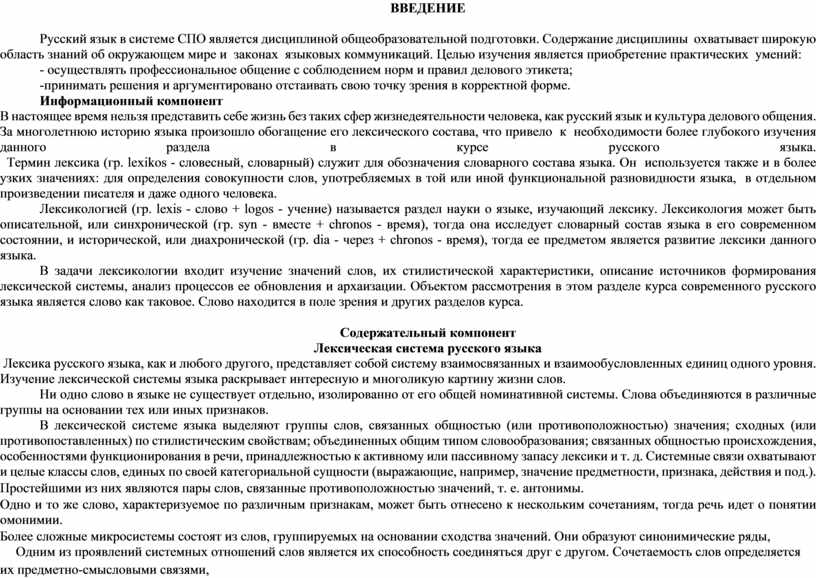 Русский язык в системе СПО является дисциплиной общеобразовательной подготовки. Содержание дисциплины охватывает широкую область знаний об окружающем мире и законах языковых коммуникаций. Целью изучения является приобретение практических умений: