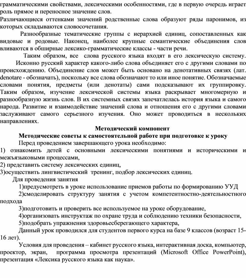 Открытый урок - «Лексика русского языка» - это завершающее занятие в разделе «Лексика» по предмету русский язык на 1 курсе по специальности СПО 19.02.10. «Технология продукции общественного питания». В процессе повторения и систематизации материала осуществляется проверка знаний и умений употребления в речи таких понятий, как лексическое значение слова, прямое и переносное значение, сфера употребления, лексическая сочетаемость, иноязычные слова, синонимы, антонимы, паронимы, фразеологические обороты, а также выявляются взаимосвязи разделов русского языка.