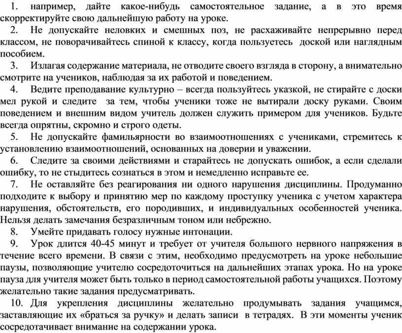 12. Ведите себя спокойно, не нервничайте, не возбуждайте класс резкими замечаниями или окриками. Для поддержания дисциплины отдельных учащихся достаточно пристального взгляда учителя или спокойного замечания без раздражения и без повышения голоса. Помните, лучшее замечание ученику – это замечание без слов: недоуменный или удивленный взгляд, пауза в рассказе.