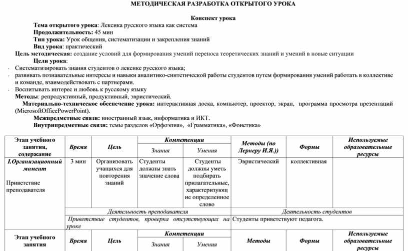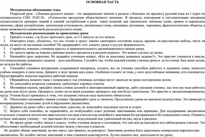 Открытый урок - «Лексика русского языка» - это завершающее занятие в разделе «Лексика» по предмету русский язык на 1 курсе по специальности СПО 19.02.10. «Технология продукции общественного питания». В процессе повторения и систематизации материала осуществляется проверка знаний и умений употребления в речи таких понятий, как лексическое значение слова, прямое и переносное значение, сфера употребления, лексическая сочетаемость, иноязычные слова, синонимы, антонимы, паронимы, фразеологические обороты, а также выявляются взаимосвязи разделов русского языка.