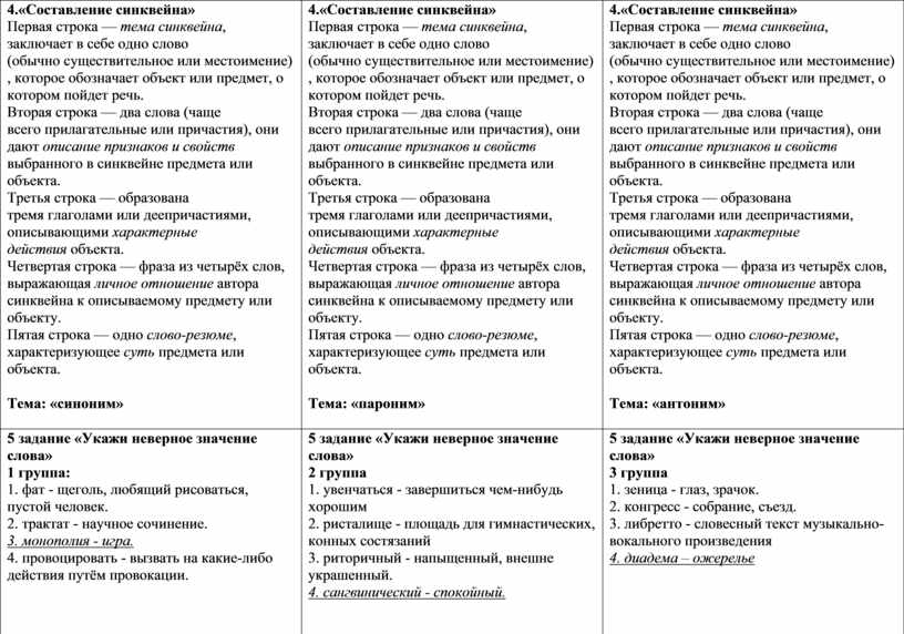 4.«Составление синквейна» Первая строка — тема синквейна, заключает в себе одно слово (обычно существительное или местоимение), которое обозначает объект или предмет, о котором пойдет речь. Вторая строка — два слова (чаще всего прилагательные или причастия), они дают описание признаков и свойств выбранного в синквейне предмета или объекта. Третья строка — образована тремя глаголами или деепричастиями, описывающими характерные действия объекта. Четвертая строка — фраза из четырёх слов, выражающая личное отношение автора синквейна к описываемому предмету или объекту. Пятая строка — одно слово-резюме, характеризующее суть предмета или объекта.