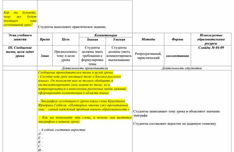 2)смоделировать структуру занятия с учетом компетентностно-деятельностного подхода