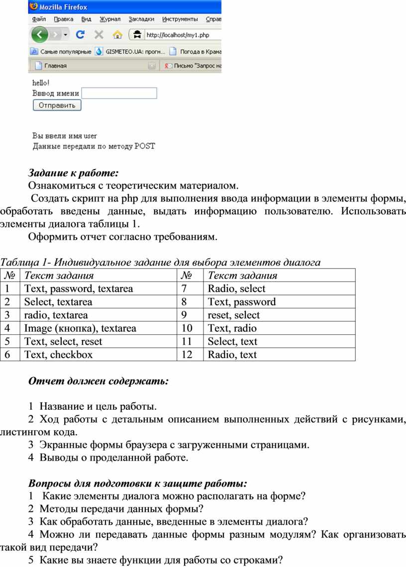 Cоздать скрипт на php для выполнения ввода информации в элементы формы, обработать введены данные, выдать информацию пользователю. Использовать элементы диалога таблицы 1.