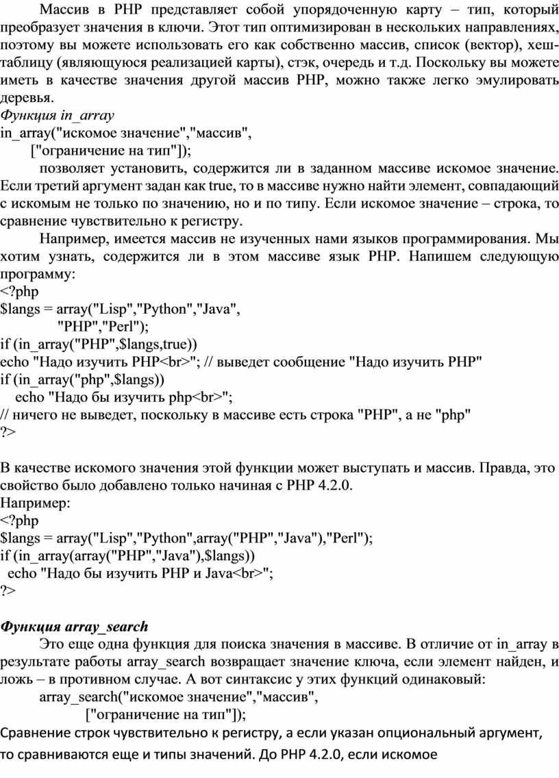 позволяет установить, содержится ли в заданном массиве искомое значение. Если третий аргумент задан как true, то в массиве нужно найти элемент, совпадающий с искомым не только по значению, но и по типу. Если искомое значение – строка, то сравнение чувствительно к регистру.