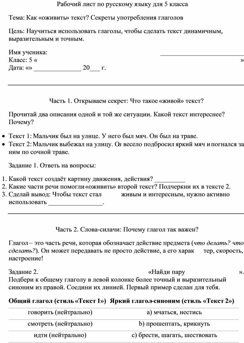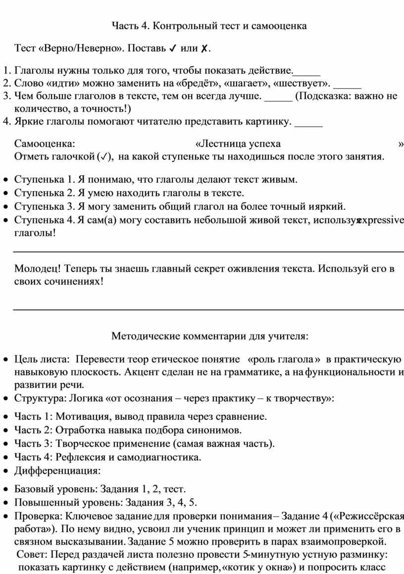 · Цель листа: Перевести теоретическое понятие «роль глагола» в практическую навыковую плоскость. Акцент сделан не на грамматике, а на функциональности и развитии речи.
