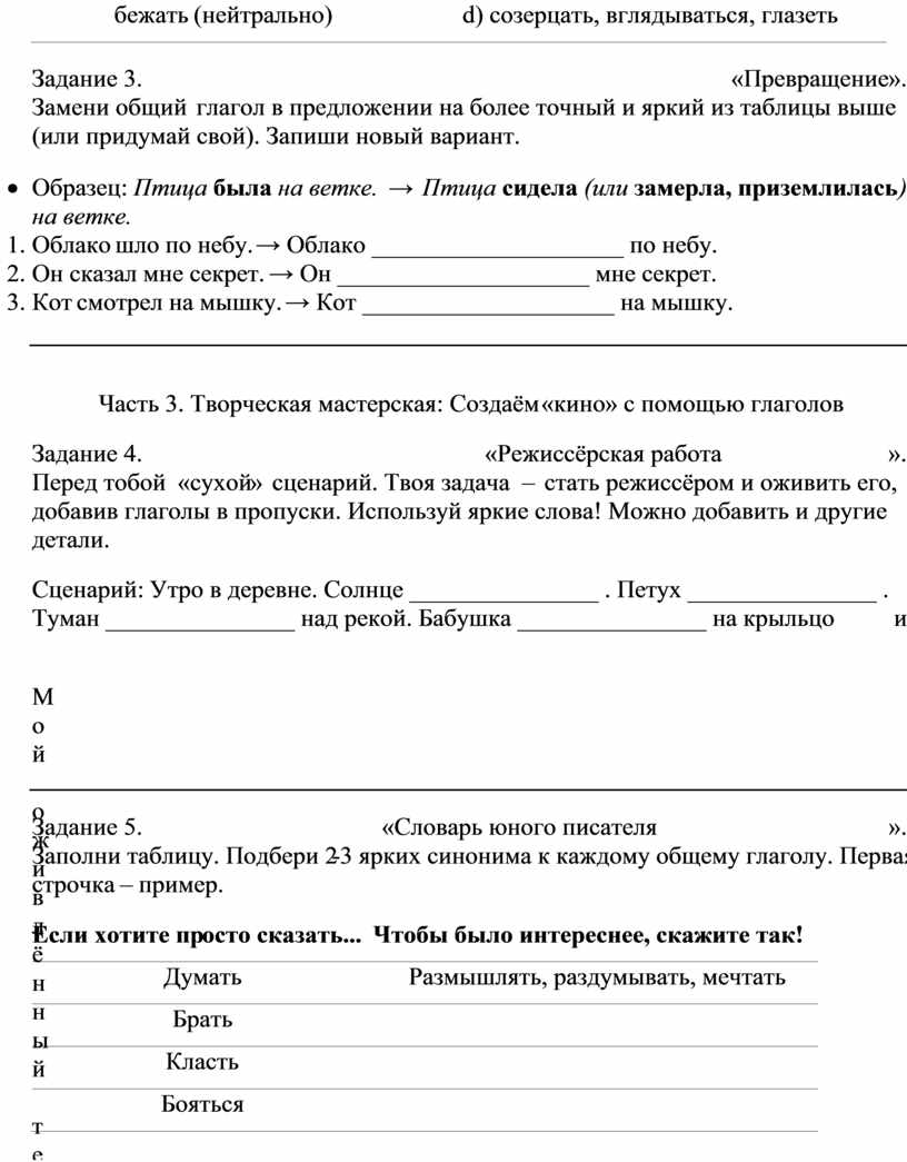 Замени общий глагол в предложении на более точный и яркий из таблицы выше (или