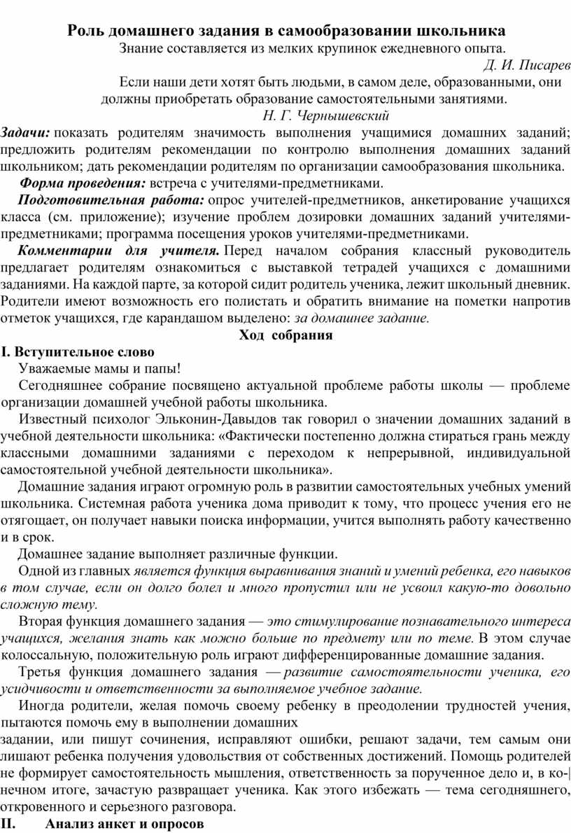 Сегодняшнее собрание посвящено актуальной проблеме работы школы — проблеме организации домашней учебной работы школьника.