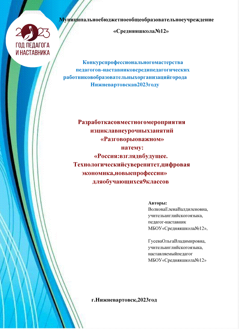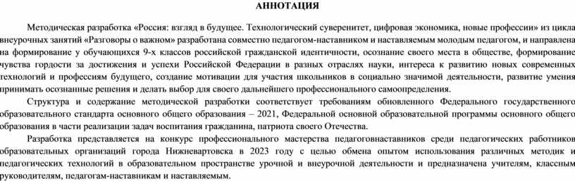 Методическая разработка «Россия: взгляд в будущее. Технологический суверенитет, цифровая экономика, новые профессии» из цикла внеурочных занятий «Разговоры о важном» разработана совместно педагогом-наставником и наставляемым молодым педагогом, и направлена на формирование у обучающихся 9-х классов российской гражданской идентичности, осознание своего места в обществе, формирование чувства гордости за достижения и успехи Российской Федерации в разных отраслях науки, интереса к развитию новых современных технологий и профессиям будущего, создание мотивации для участия школьников в социально значимой деятельности, развитие умения принимать осознанные решения и делать выбор для своего дальнейшего профессионального самоопределения.