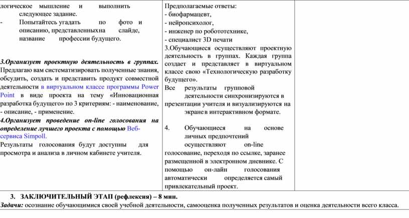Предполагаемые ответы: - биофармацевт, - нейропсихолог, - инженер по робототехнике, - специалист 3D печати 3.Обучающиеся осуществляют проектную деятельность в группах. Каждая группа создает и представляет в виртуальном классе свою «Технологическую разработку будущего». Все результаты групповой деятельности синхронизируются в презентации учителя и визуализируются на экране в интерактивном формате. 4. Обучающиеся на основе личных предпочтений осуществляют on-line голосование, переходя по ссылке, заранее размещенной в электронном дневнике. С помощью он-лайн голосования автоматически определяется самый привлекательный проект. |