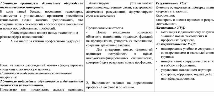 1.Учитель организует дальнейшее обсуждение тематического материала. В ходе нашей беседы, посещения технопарка, знакомства с уникальными проектами российских гениальных людей логично предположить, что создание новых технологий способствуют появлению и новых востребованных профессий. - Какие изменения вносят новые технологии в разные сферы нашей жизни? - А вы знаете за какими профессиями будущее? Итак, из наших рассуждений можно сформулировать следующую логическую цепочку: Потребность-идея-технология-освоение-новая профессия! 2.Учитель побуждает обучающихся к дальнейшим логическим размышлениям. Предлагаю вам продолжить дальше развивать |