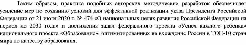 Таким образом, практика подобных авторских методических разработок обеспечивает усиление мер по созданию условий для эффективной реализации указа Президента Российской Федерации от 21 июля 2020 г. № 474 «О национальных целях развития Российской Федерации на период до 2030 года» и достижения задач федерального проекта «Успех каждого ребенка» национального проекта «Образование», оптимизированных на вхождение России в ТОП-10 стран мира по качеству образования.