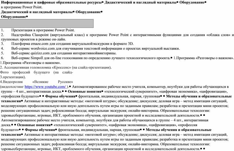 1.Программа «Разговоры о важном». 2. Ассоциативная головоломка «Кроссенс» (на слайд-презентации). Фото профессий будущего (на слайд- 3.презентации). 4.Видеоролик «Великие Русские» (видеохостинг https://www.youtube.com/ ). |