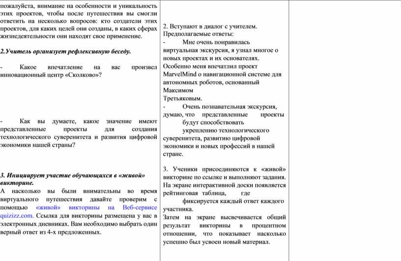 пожалуйста, внимание на особенности и уникальность этих проектов, чтобы после путешествия вы смогли ответить на несколько вопросов: кто создатели этих проектов, для каких целей они созданы, в каких сферах жизнедеятельности они находят свое применение. 2.Учитель организует рефлексивную беседу. - Какое впечатление на вас произвел инновационный центр «Сколково»? - Как вы думаете, какое значение имеют представленные проекты для создания технологического суверенитета и развития цифровой экономики нашей страны? 3. Инициирует участие обучающихся в «живой» викторине. А насколько вы были внимательны во время виртуального путешествия давайте проверим с помощью «живой» викторины на Веб-сервисе quizizz.com. Ссылка для викторины размещена у вас в электронных дневниках. Вам необходимо выбрать один верный ответ из 4-х предложенных. |
