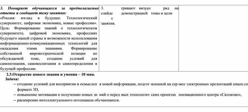 3. Поощряет обучающихся за предполагаемые ответы и сообщает тему занятия: «Россия: взгляд в будущее. Технологический суверенитет, цифровая экономика, новые профессии». Цель: Формирование знаний о технологическом суверенитете, цифровой экономике, профессиях будущего нашей страны и возможности использования информационно-коммуникационных технологий для овладения этими знаниями. Формирование собственной мировоззренческой позиции по обсуждаемой теме, создание условий для самопознания, самовоспитания и самоопределения в будущей профессии. |