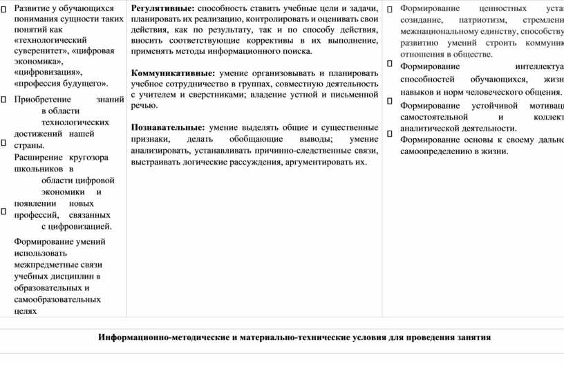 Образовательная: Формирование и развитие у обучающихся научных знаний в области технологических достижений нашей страны. Развитие у обучающихся понимания сущности таких понятий как «технологический суверенитет», «цифровая экономика», «цифровизация», «профессия будущего». Расширение кругозора школьников в области цифровой экономики и появлении новых профессий, связанных с цифровизацией. Формирование умений использовать межпредметные связи учебных дисциплин в образовательных и самообразовательных целях. Воспитательная: Воспитание положительного отношения к учению и познавательной деятельности. Формирование соответствующей внутренней позиции личности обучающегося, необходимой ему для конструктивного и ответственного поведения. Формирование гражданской позиции школьника, создание условий для его самопознания, самовоспитания и профессионального самоопределения. Формирование собственной мировоззренческой позиции по обсуждаемой теме. Развивающая: Формирование функциональной грамотности и способности решать учебные задачи и жизненные проблемные ситуации на основе сформированных предметных, метапредметных и универсальных способов деятельности (познавательная деятельность, речевая деятельность, работа с источниками информации, работа на цифровых образовательных |