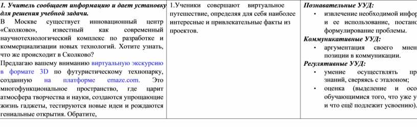 1. Учитель сообщает информацию и дает установку для решения учебной задачи. В Москве существует инновационный центр «Сколково», известный как современный научнотехнологический комплекс по разработке и коммерциализации новых технологий. Хотите узнать, что же происходит в Сколково? Предлагаю вашему вниманию виртуальную экскурсию в формате 3D по футуристическому технопарку, созданную на платформе emaze.com. Это многофункциональное пространство, где царит атмосфера творчества и науки, создаются упрощающие жизнь гаджеты, тестируются новые идеи и рождаются гениальные открытия. Обратите, |