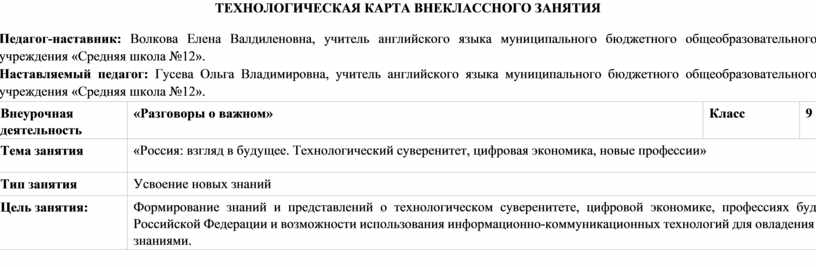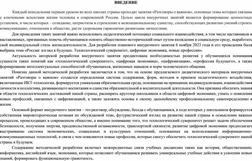 Для проведения таких занятий важно использовать педагогический потенциал социального взаимодействия, в том числе наставников и наставляемых, призванных помочь обучающимся освоить общественно-исторический опыт путем вхождения в социальную среду, выработать свой индивидуальный стиль жизнедеятельности. Для разработки планового внеурочного занятия 6 ноября 2023 года и его проведения была выбрана тема «Россия: взгляд в будущее. Технологический суверенитет, цифровая экономика, новые профессии».