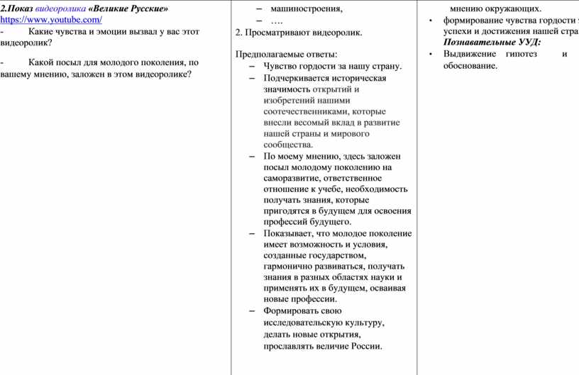 – машиностроения, – …. 2. Просматривают видеоролик. Предполагаемые ответы: – Чувство гордости за нашу страну. – Подчеркивается историческая значимость открытий и изобретений нашими соотечественниками, которые внесли весомый вклад в развитие нашей страны и мирового сообщества. – По моему мнению, здесь заложен посыл молодому поколению на саморазвитие, ответственное отношение к учебе, необходимость получать знания, которые пригодятся в будущем для освоения профессий будущего. – Показывает, что молодое поколение имеет возможность и условия, созданные государством, гармонично развиваться, получать знания в разных областях науки и применять их в будущем, осваивая новые профессии. – Формировать свою исследовательскую культуру, делать новые открытия, прославлять величие России. |