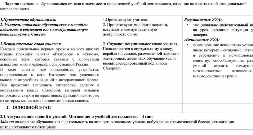 1.Приветствие обучающихся. 2. Учитель знакомит обучающихся с молодым педагогом и вовлекает его в коммуникативную деятельность с классом. 2.Вступительное слово учителя. Каждый понедельник первым уроком во всех школах страны проходят занятия «Разговоры о важном», основные темы которых связаны с ключевыми аспектами жизни человека в современной России. В ходе занятия нам понадобятся устройства, подключенные к сети Интернет для успешного выполнения учебных заданий в интерактивной форме. Вам предстоит выполнить интересные задания в виртуальном классе Classpoint, который оснащен широким спектром интерактивных функций, некоторые из которых мы сегодня на занятии с вами освоим. |