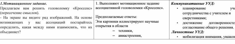 1. Выполняют мотивационное задание ассоциативной головоломки «Кроссенс». Предполагаемые ответы: Эти картинки иллюстрируют научные открытия в области – техники, – авиастроения, |