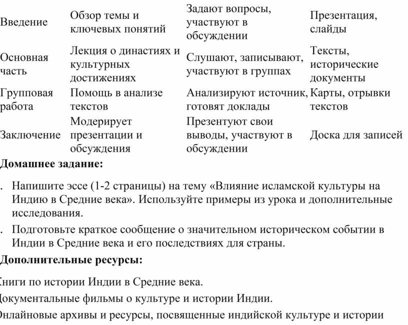 1. Напишите эссе (1-2 страницы) на тему «Влияние исламской культуры на Индию в Средние века». Используйте примеры из урока и дополнительные исследования.