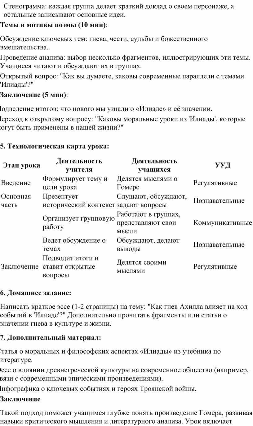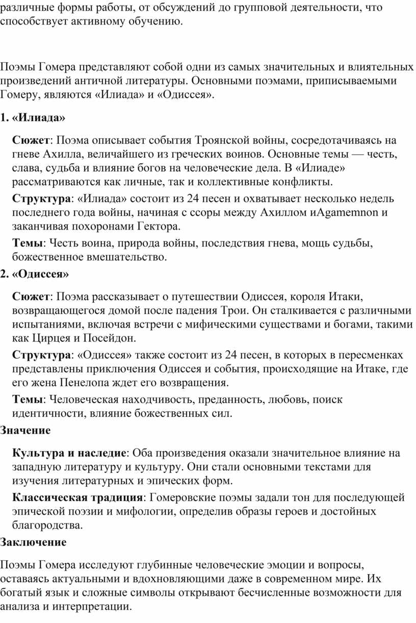 Такой подход поможет учащимся глубже понять произведение Гомера, развивая навыки критического мышления и литературного анализа. Урок включает различные формы работы, от обсуждений до групповой деятельности, что способствует активному обучению.