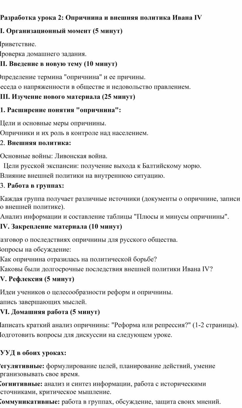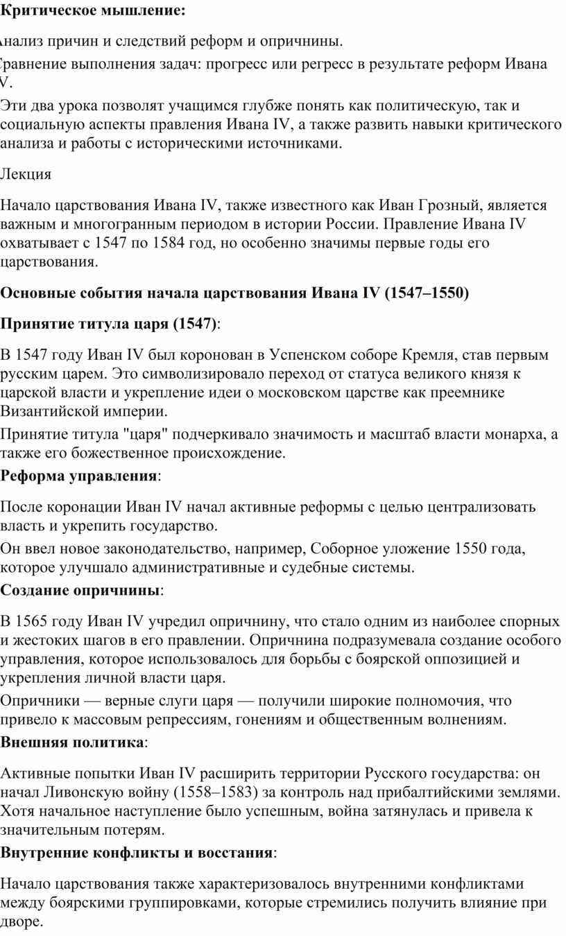 Эти два урока позволят учащимся глубже понять как политическую, так и социальную аспекты правления Ивана IV, а также развить навыки критического анализа и работы с историческими источниками.