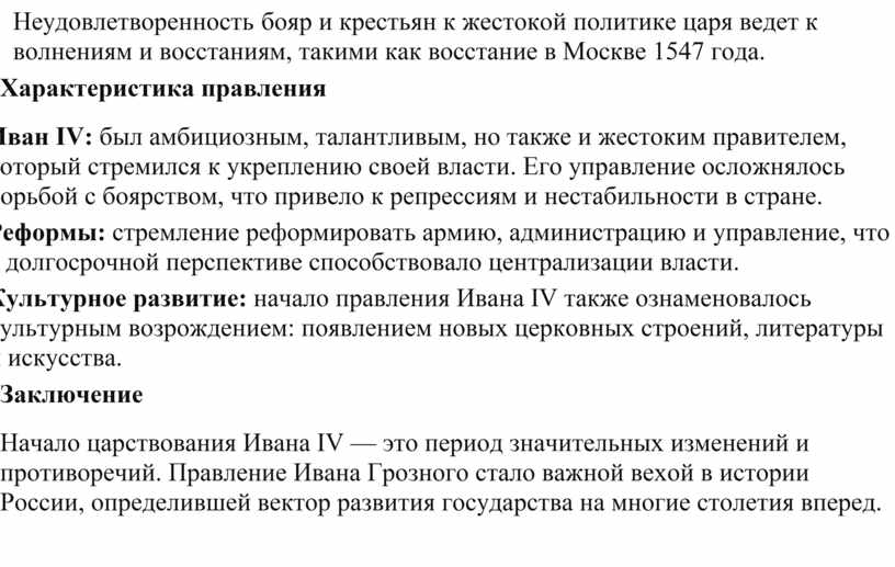 Начало царствования Ивана IV — это период значительных изменений и противоречий. Правление Ивана Грозного стало важной вехой в истории России, определившей вектор развития государства на многие столетия вперед.