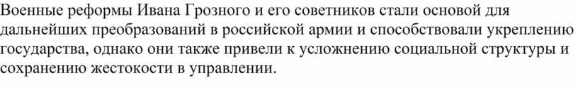 Военные реформы Ивана Грозного и его советников стали основой для дальнейших преобразований в российской армии и способствовали укреплению государства, однако они также привели к усложнению социальной структуры и сохранению жестокости в управлении.