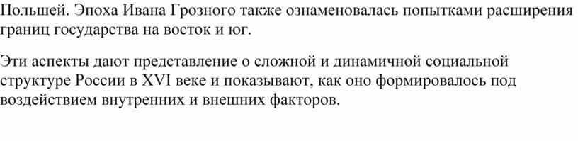 Эти аспекты дают представление о сложной и динамичной социальной структуре России в XVI веке и показывают, как оно формировалось под воздействием внутренних и внешних факторов.