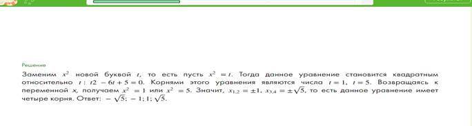 Определение 1. Способ решения биквадратного уравнения, когда корни находятся путем решения квадратного уравнения относительно новой переменной t = x2, называется способом (методом) замены переменной.