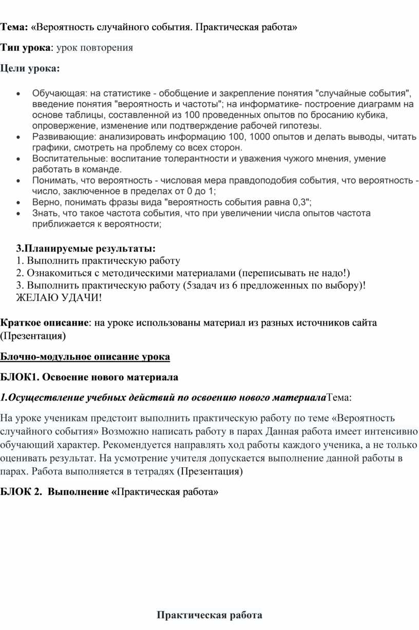 На уроке ученикам предстоит выполнить практическую работу по теме «Вероятность случайного события» Возможно написать работу в парах Данная работа имеет интенсивно обучающий характер. Рекомендуется направлять ход работы каждого ученика, а не только оценивать результат. На усмотрение учителя допускается выполнение данной работы в парах. Работа выполняется в тетрадях (Презентация)