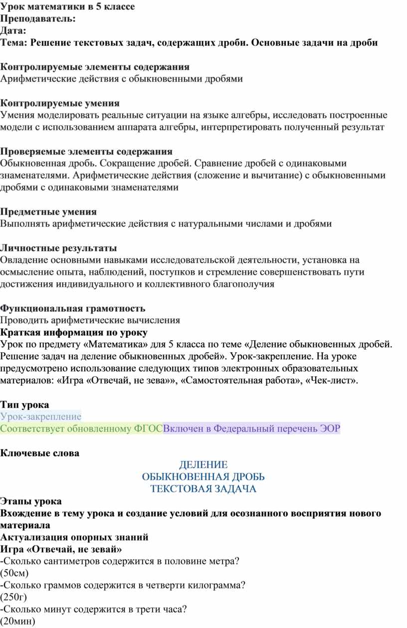 Урок по предмету «Математика» для 5 класса по теме «Деление обыкновенных дробей. Решение задач на деление обыкновенных дробей». Урок-закрепление. На уроке предусмотрено использование следующих типов электронных образовательных материалов: «Игра «Отвечай, не зева»», «Самостоятельная работа», «Чек-лист».