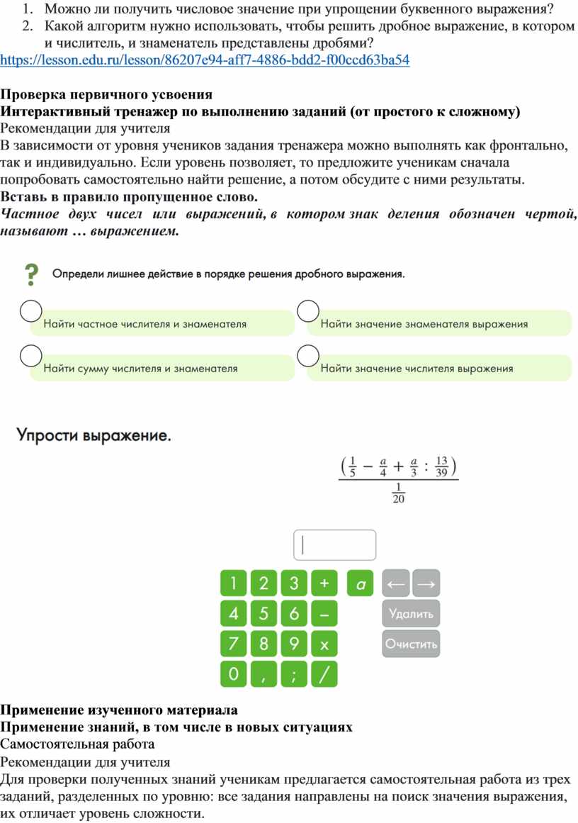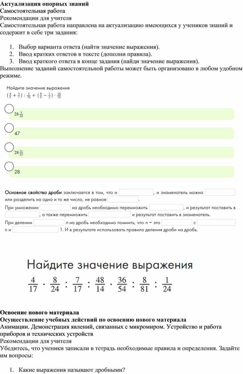 Урок по предмету «Математика» для 5 класса по теме «Числовые и буквенные выражения, содержащие обыкновенные дроби. Упрощение выражений». Урок освоения новых знаний и умений. На уроке предусмотрено использование следующих типов электронных образовательных материалов: «Анимации. Демонстрация явлений, связанных с микромиром. Устройство и работа приборов и технических устройств», «Интерактивный тренажер по выполнению заданий (от простого к сложному)», «Самостоятельная работа».